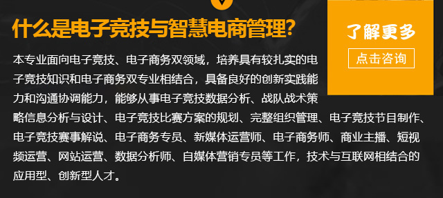 通過本專業(yè)的系統(tǒng)學習,畢業(yè)后可擔任的職位有電子競技數(shù)據(jù)分析、戰(zhàn)隊戰(zhàn)術策略信息分析與設計、電子競技比賽方案的規(guī)劃、電子競技賽事解說、電子商務專員、新媒體運營師、電子商務師、商業(yè)主播、短視頻運營、網(wǎng)站運營、數(shù)據(jù)分析師等。